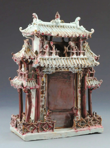 古时,粮食及相关器皿成为不可或缺的陪葬用品,最具象征性的器物就是谷仓。青花釉里红楼阁式谷仓不是常见的单面建筑样式,而是前后两面皆为舞台的立体建筑,两面各有亭楼,面阔三间,八柱支撑,瓦是釉里红点彩串珠组成。此样式正是模仿景德镇地区古代流行的祠堂戏台或睛雨戏台建筑。