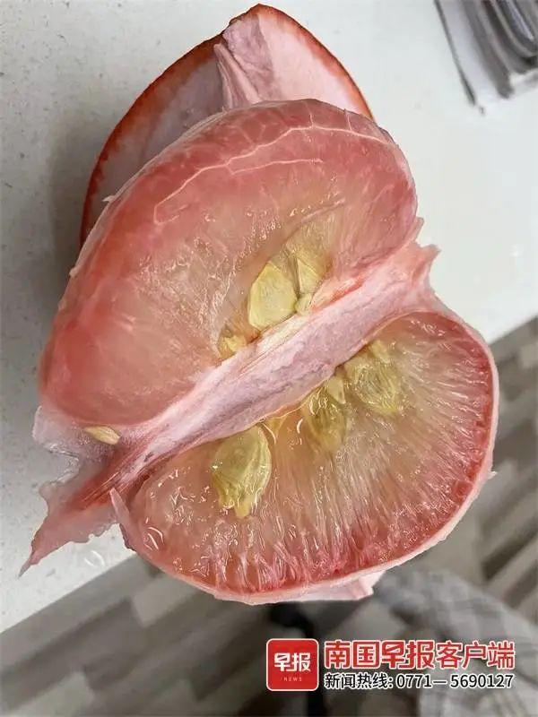 记者花88元购买了一个香水红柚,只见其外形与沙田柚相似,但皮是大红色的,散发着清香味。剥开果皮,果肉偏粉红色,水分较多、味道清甜。