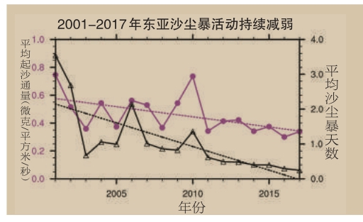近二十年来,我国北方和蒙古国南部的大部分地区风速呈减弱的趋势,特别是沙尘暴最强的春季,减弱最为明显。东亚主要沙尘源区的春季平均风速从2001年至2002年的5.1米/秒减弱到了2016年至2017年的4.8米/秒,平均减弱趋势为每10年0.17米/秒,16年间减弱了5%。分析还发现,风速的减弱特征主要体现在强风(大于10米/秒)的出现频次有明显的减弱。由于强风对起沙量的贡献最为显著,强风频次的减少会导致起沙量明显减小,很大程度上造成了沙尘暴强度的减弱。