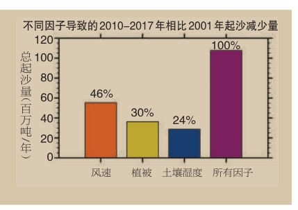 风速、植被覆盖、土壤湿度作为地球气候环境的重要组成,受到整个气候系统演变的影响。总体上看,气象要素变化是近二十年来沙尘活动减弱的主要原因。