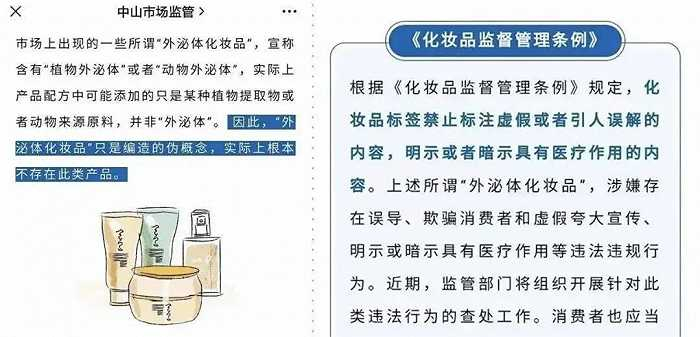 9月6日,“中山市场监管”公众号发布了《消费警示丨“外泌体化妆品”是个伪概念》一文,并指出外泌体在医学及化妆品领域的应用效果并未受到广泛认可,相关应用试验仍处于临床研究阶段。短短数月内,外泌体就经历了从爆火到被官方打假的戏剧性时刻,相关护肤产品备案相继被注销。