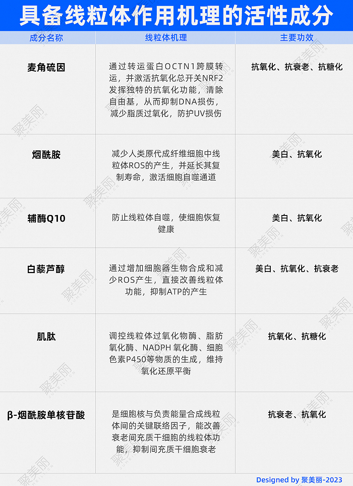 2021年发表在《中国化妆品》上的文章《线粒体是精准护肤的黄金靶点》中曾提到,研究表明,烟酰胺可减少人类原代成纤维细胞中线粒体ROS的产生,并延长其复制寿命;辅酶Q10可防止线粒体自噬,使细胞恢复健康;白藜芦醇可通过增加细胞器生物合成和减少ROS产生,直接改善线粒体功能,发挥抗氧化及抗衰老作用。