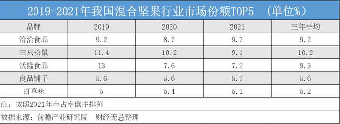 根据前瞻产业研究院的一组调研数据显示,2019年以前,沃隆在混合坚果行业中市场份额最高,2019年达到13%,位居行业第一;2020年市场份额为7.6%,行业排名第三;2021年市场份额为7.2%,行业排名第三。