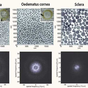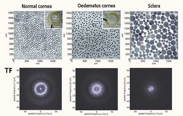 眼角膜的透明组织十分独特,其透光性源于其结构特质。结缔组织基质层占角膜厚度的90%,由纳米级胶原纤维组成,纤丝在角膜薄片内有序排列,直径一致,因此除了直接透射光之外,其他方向射入的光线都会被严重散射,故体现为高度透明。只有直接通过角膜和晶状体进入眼球的光线才能在视网膜上成像。
