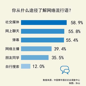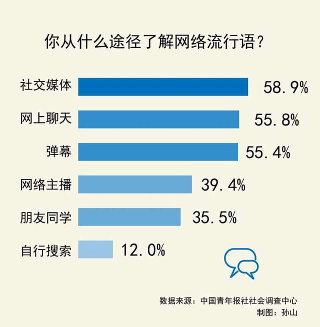 数据显示,微博、小红书、微信等社交媒体(58.9%)是受访青年知晓网络流行语的主要途径。接下来是网上聊天(55.8%)、弹幕(55.4%)。其他还有:网络主播(39.4%)、朋友同学(35.5%)和自行搜索(12.0%)等。