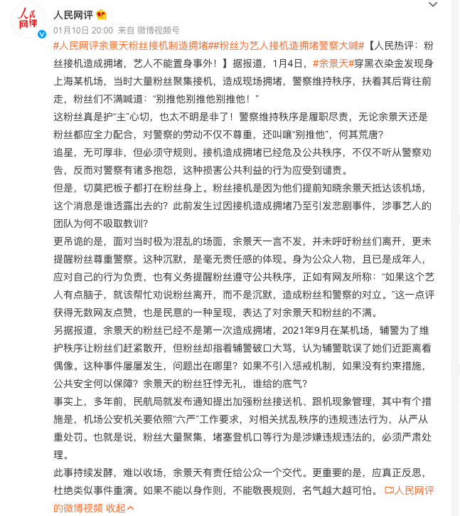 今日,#人民网评余景天粉丝接机制造拥堵#一话题登顶热搜。