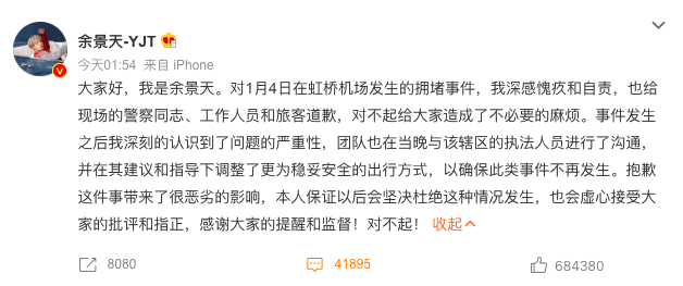 在事发后的第7天,也就是11日凌晨,余景天就粉丝接机致机场拥堵一事致歉:深感愧疚和自责,保证以后会坚决杜绝这种情况发生,也会虚心接受大家的批评和指正。