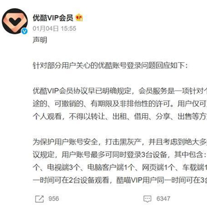 针对部分用户关心的优酷账号登录问题,优酷近日回应称,优酷VIP协议规定,用户账号最多可同时登录3台设备,其中包含:手机端App1个、Pad端App1个、电视端3个、电脑客户端1个、网页端1个、车载端1个、其他端1个。优酷VIP用户同一时间可在2台设备观看,酷喵VIP用户同一时间可在3台设备观看。