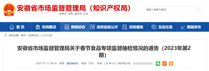中国质量新闻网讯 2023年1月11日,安徽省市场监督管理局关于春节食品专项监督抽检情况的通告(2023年第2期)。据通告,春节前夕,安徽省市场监督管理局组织开展2023年春节食品安全专项监督抽检,共抽检598批次样品。其中,抽检免浆黑鱼片等速冻食品45批次,根据食品安全国家标准检验和判定,全部合格。