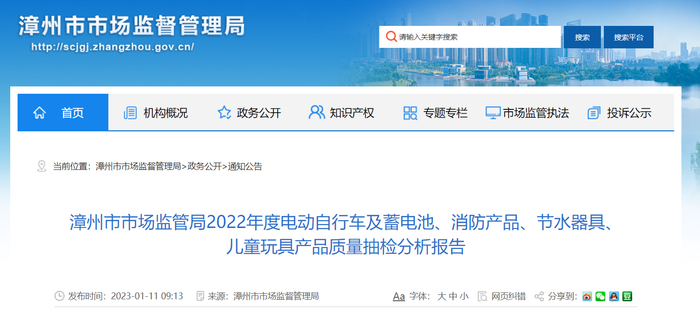福建省漳州市市场监管局公布2022年度电动自行车及蓄电池、消防产品等产品抽查结果