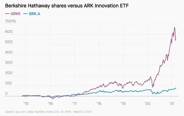 华尔街见闻此前提及,因积极投资于创新型科技股,木头姐管理的明星基金产品ARKK从2014年创立至2020年底涨幅超过600%,资产规模从十几亿美元升至六百多亿美元,使其名声大噪。同时期巴菲特管理的伯克希尔·哈撒韦(Berkshire Hathaway)的A基金仅涨了约80%。