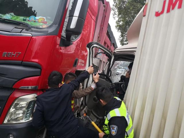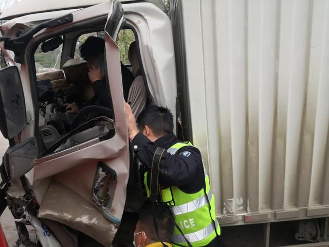 事情发生在陆屋中队辖区的三隆镇供电所转弯路段,一辆桂ARA***号牌厢式货车与一车桂NB1***号牌重型自卸货车会车时发生碰撞。事发后,一名驾驶人被卡在驾驶室里不能动弹。