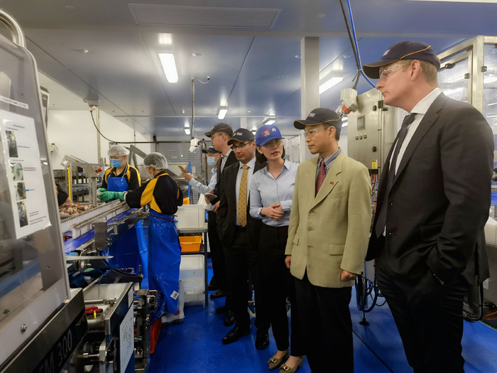在巴叟主席、麦特首席执行官等陪同下,龙总领事参观了吉龙腾公司弗里曼特尔(Fremantle)冻品生产加工厂,了解产品生产和销售情况。