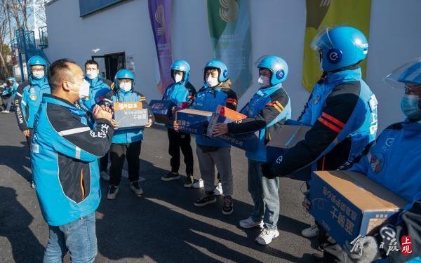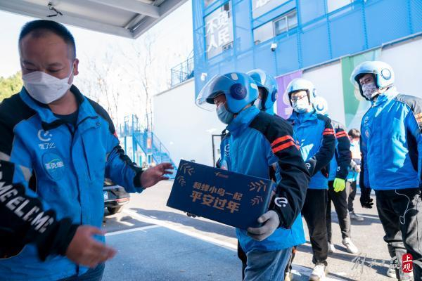 春节将至,2023年1月11日,在普陀区饿了么宜川、真华路站,站内170多名骑手领到了公司发放的定制新春礼盒。