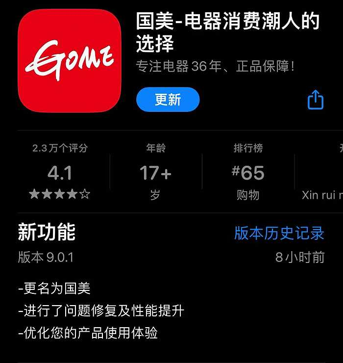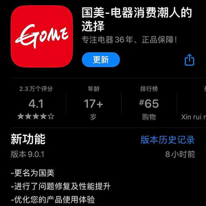 1月10日,国美线上电商平台“真快乐”App发布9.0.0版更新。新版本除修复了相关问题、优化产品体验外,其App名也重新变为“国美”,并定义为“电器潮人的选择”。