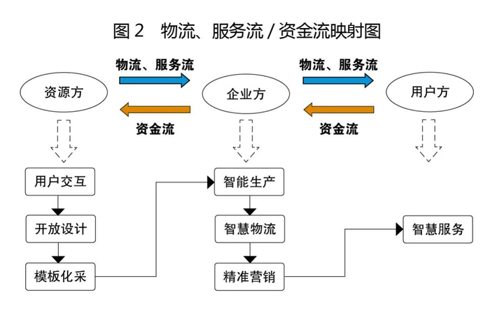 4.企业信息边界从清晰走向模糊。在传统商业模式下,企业信息相对封闭,内部信息难以与外部共享。但是在工业互联网模式下.企业的信息边界由清晰变得模糊,智慧生产体系里的所有生产信息都是可以共享的。比如模块生产商的产品设计、生产参数与采购订单都是来自下游的需求企业,同时其产量、价格、物流等信息也要即时发送给平台,其支付结算和现金管理也离不开平台的金融服务模块,企业的物流、资金流以及信息流都通过平台与外部高度共享,企业的边界已经变得十分模糊。