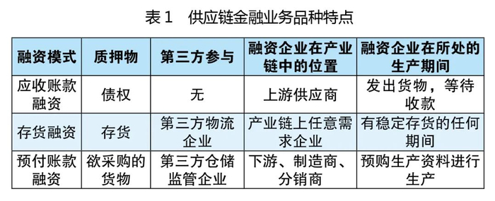 国内开展的供应链金融起源于银行,却发展壮大于互联网金融巨头。从深圳发展银行首次提出“1+N”模式的供应链金融业务模式开始,国内各大银行相继推出种类繁多的供应链金融服务模式,意在通过盘活企业的资产,解决企业在产供销不同阶段的资金缺口(见表1)。