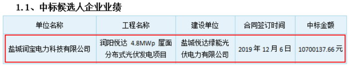据光伏项目中标公告,同样在候选人公示中,“中标候选人企业业绩”一栏披露,建湖绿能光伏项目的候选人单位名称为盐城润宝,工程名称为“润阳悦达4.8MWp屋面分布式光伏发电项目”,建设单位为盐城悦达,合同签订时间为2019年12月6日,中标金额为1,070.01万元。