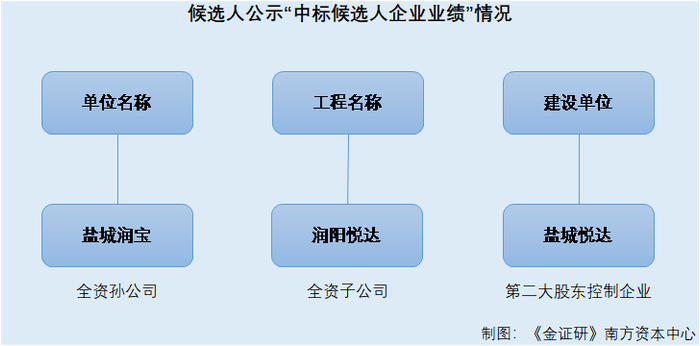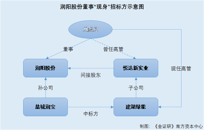 由此可知,润阳股份孙公司盐城润宝,曾中标润阳股份间接股东下属企业建湖绿能的招标项目。与此同时,润阳股份的董事姜成芝在建湖绿能担任高管,即同时“现身”招标方和投标方。