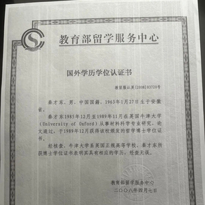 ↑教育部留学服务中心关于秦才东的国外学位认证书