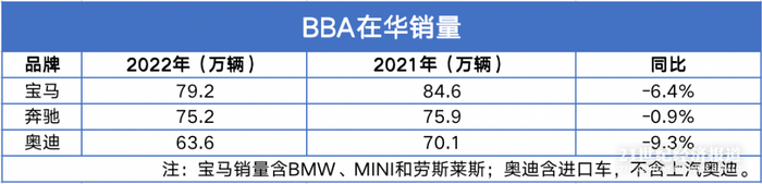 奔驰方面,虽然2022年延续了2021年销量下滑的态势,但2022年在华销量达到75.17万辆,下滑幅度已收紧至0.9%,成为BBA三家中下滑幅度最小的品牌。