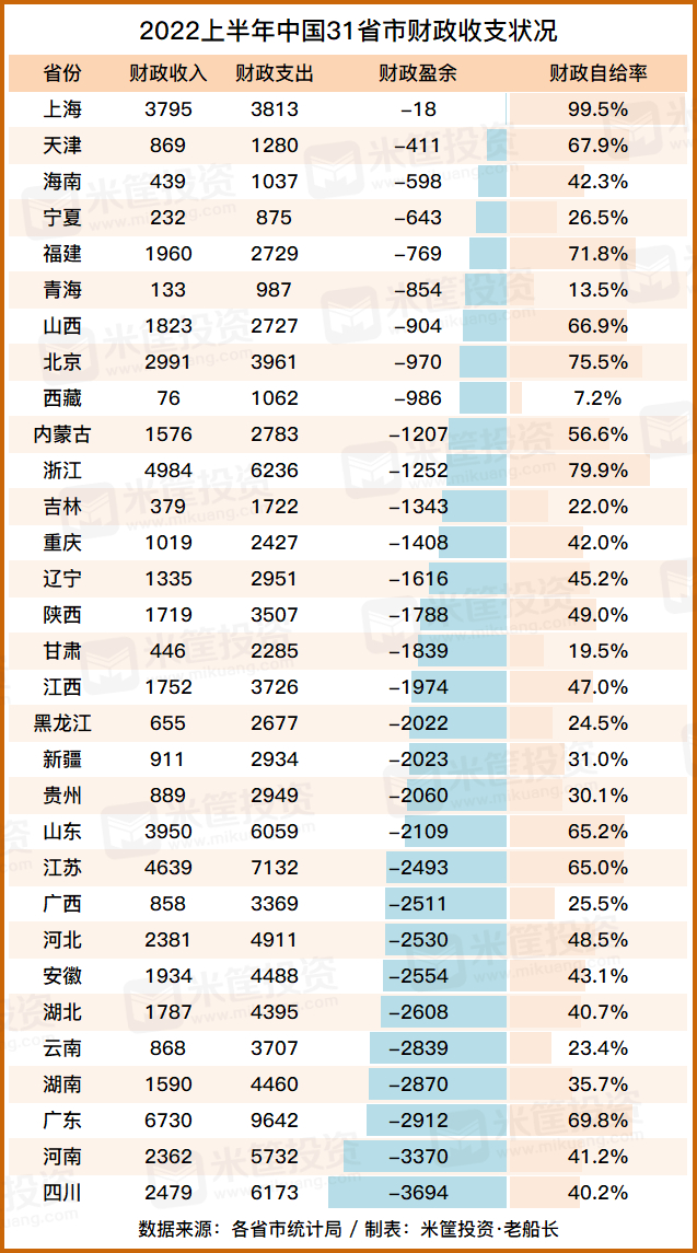 即便是财政自给率最高的上海,上半年也因为疫情的因素,财政盈余变为负数。