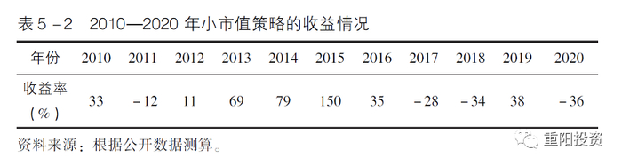 举个简单的例子, 小市值策略曾经是A 股市场当中非常有效的投资策略。我曾经就做过这么一个简单的小市值策略: 每年1月1日选择10 只市值最小的股票, 每只股票配置10% 的仓位, 每年1月1 日调仓一次。就这么一个简单的策略, 从2010 年开始, 直到2016 年年底, 7 年的累计收益率高达12. 3倍, 超过许多机构投资者的业绩。但这个策略放到2017 年以后, 会让你亏损累累, 到2020 年年底, 累计会亏损58% (见表5 -2)。