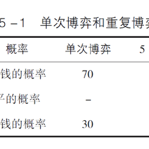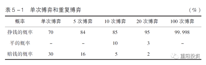 举个例子, 假设你拥有一套大概率正确, 并且可复制的投资策略, 这套策略每次正确(挣1 元钱) 的概率能达到70%。如果只投资一次, 你赔钱(赔1 元钱) 的概率还有30%; 如果投资5 次,赔钱的概率只有16%了; 如果投资10次, 赔钱的概率只有5% 了;如果投资20次, 赔钱的概率只有2%了(见表5-1)。如果投资100次, 那你几乎是百分之百能挣钱了。