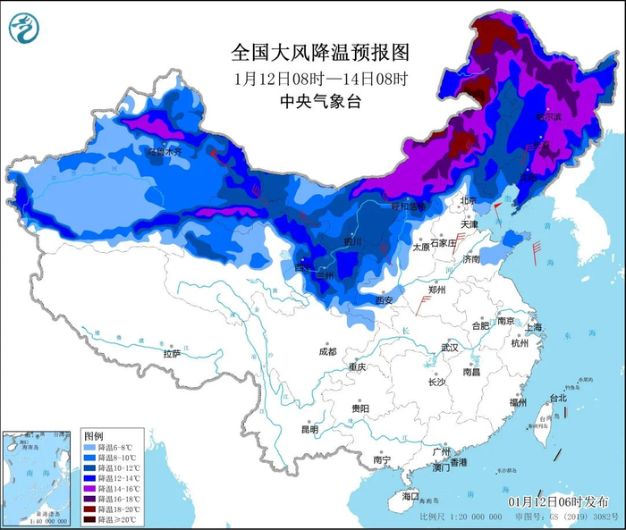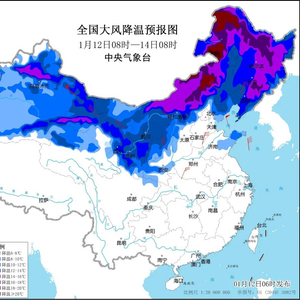 此外,中央气象台1月12日6时继续发布寒潮蓝色预警。1月12日8时至1月16日8时,寒潮天气将自西向东影响我国大部地区。其中,12日主要影响西北地区,13日至15日影响我国中东部地区。我国大部地区气温将先后下降8℃至12℃。