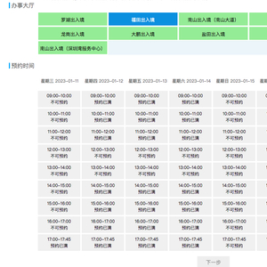 1月11日,界面新闻大湾区频道记者登陆深圳市公安局出入境业务网站发现,截至1月18日,深圳全市11个出入境办事大厅几乎全部预约已满,只有个别时段显示还剩1个名额。