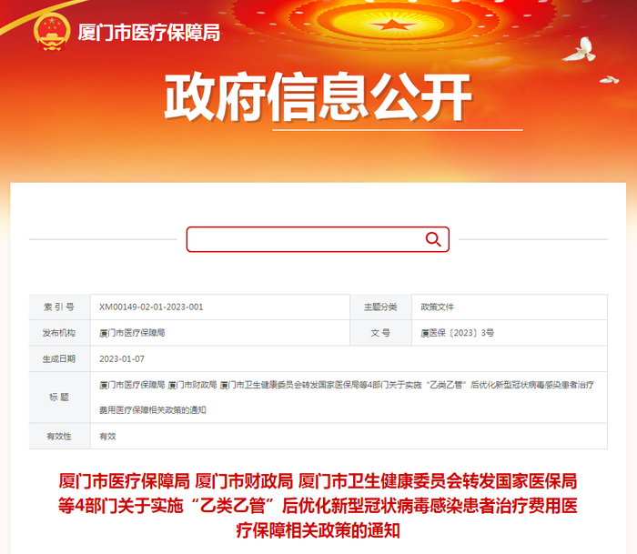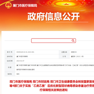 近日,厦门市医保局、财政局和卫健委三部门联合发文,公布实施“乙类乙管”后优化新型冠状病毒感染患者治疗费用医疗保障相关政策。