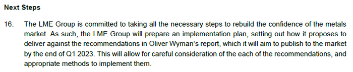 LME表示,将打算仔细考虑这些建议。LME集团拟编制一项实施计划,阐述如何按照奥纬咨询报告中的建议实施,预计在2023年第一季度结束前向市场发布。LME将仔细评估具体措施的市场影响和任何潜在的意外后果。