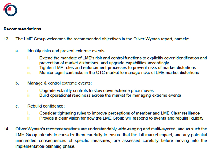 LME着重称:“LME集团致力于采取一切必要措施重建金属市场的信心。”(The LME Group is committed to taking all the necessary steps to rebuild the confidence of the metals market.)