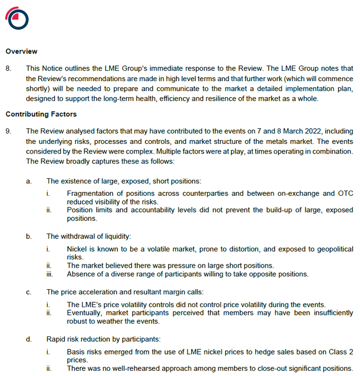 报告称,奥纬咨询此次评估是受LME委托开展的,评估的主要目标是识别2022年3月7日及8日导致镍市场剧烈波动的因素,并向LME提出建议,以减少类似事件再次发生的可能性。