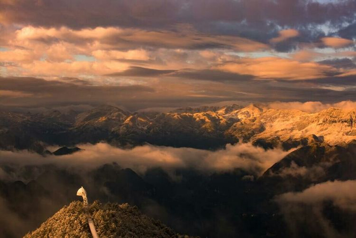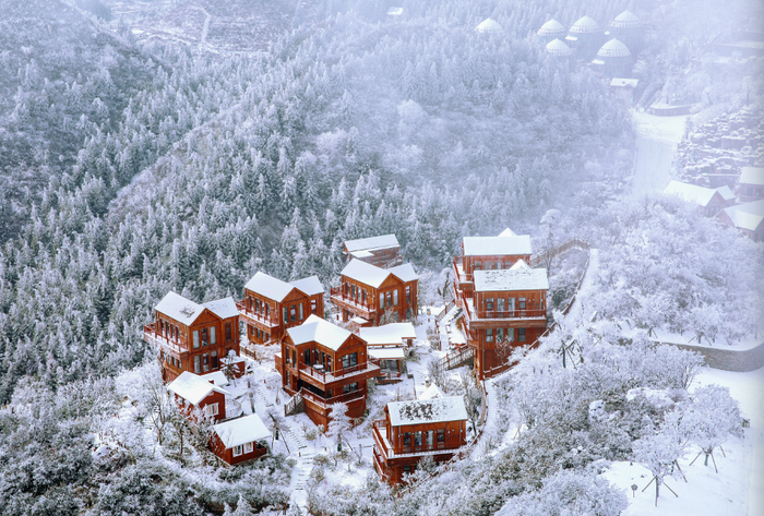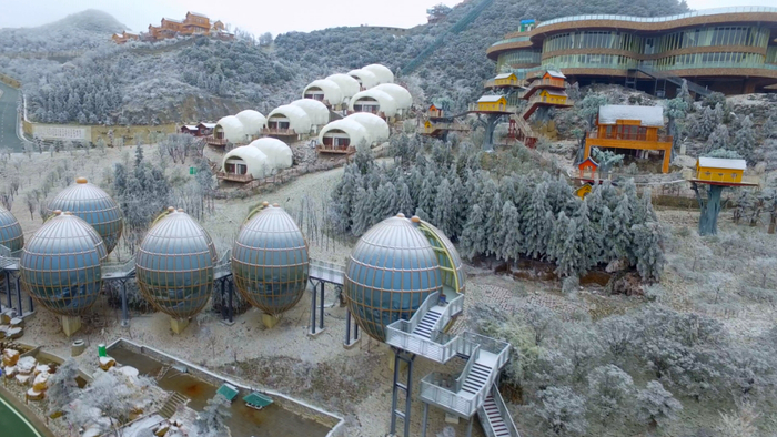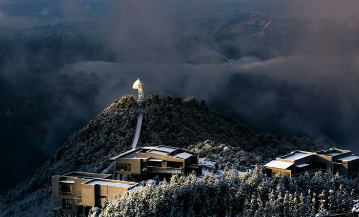 天空之恋主题酒店酒店建筑采用钢结构独立柱基,将23栋单体建筑支撑于群山之上,群峰之险一览无遗,可感受一番“云无心以出岫,鸟倦飞而知还”的超然境界。在复杂气象条件下,这里也能观赏到只有海拔4500米以上高原地区雪后放晴才会出现的“日照金山”现象。
