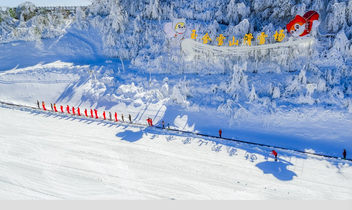 梅花山不仅有着世界最长观光索道依托,更是目前西南最大的滑雪场,占地91700平方米,全长1880米。其以“冰雪童话”为主题,立足为游客提供“山中滑雪,山上戏水,山下畅游”的独有乐趣。