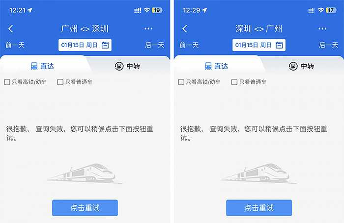 记者通过12306搜索广州前往深圳的车票,页面显示“很抱歉,查询失败”。而深圳前往广州的车票,1月12日至1月14日仍可够买,1月15日及之后无法显示。