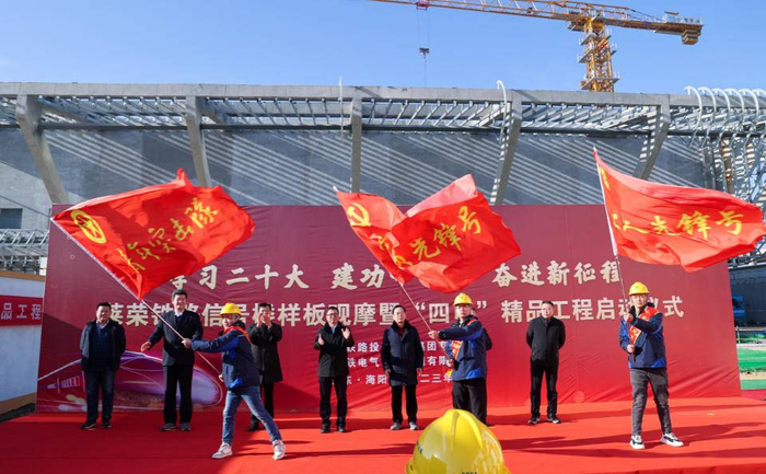 2023年1月11日,山东铁投集团组织在烟台海阳市举办莱荣高铁“四电”精品工程样板观摩暨启动仪式,标志着莱荣高铁由线下全面转入线上工程施工,为莱荣高铁2023年建成通车打下了坚实基础。