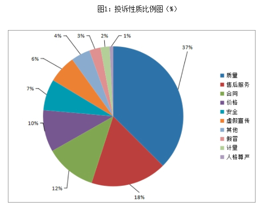 54189件消费者投诉中,涉及质量问题的投诉20309件,占总量的37.48%;售后服务问题9479件,占17.49%;合同问题6390件,占11.79%;价格问题5213件,占9.62%;安全问题3923件,占7.24%;虚假宣传问题3491件,占6.44%;假冒问题1405件,占2.59%;计量问题1136件,占2.10%;人格尊严问题449件,占0.83%;其他问题(涉及多项投诉性质或难以归类的投诉问题)2383件,占4.40%。