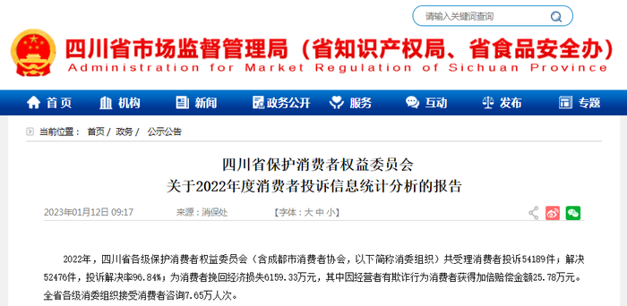 四川省保护消费者权益委员会关于2022年度消费者投诉信息统计分析的报告