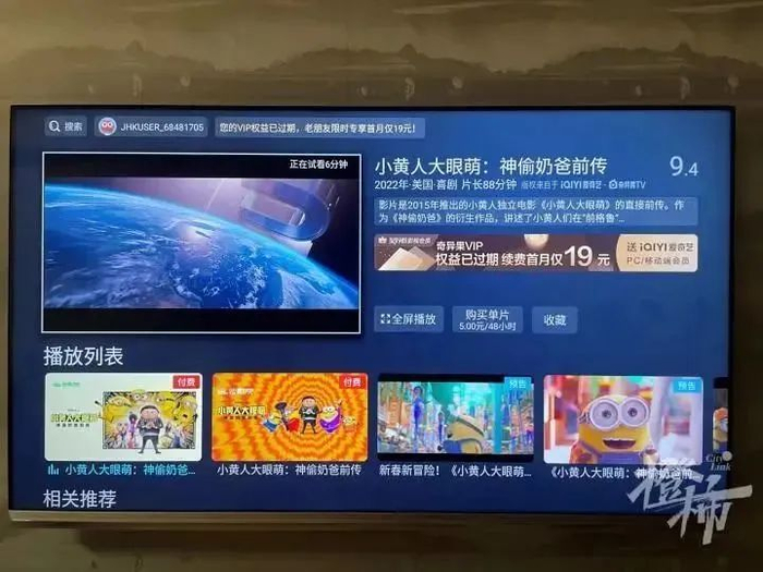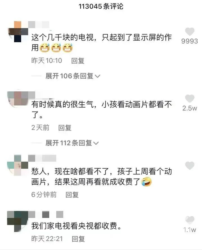 看个电影,20元一个月。看个电视剧,29元一个月。孩子的动画片是最贵的,39元一个月。这两天,山东烟台一位妈妈在视频里吐槽智能电视的内容收费,如果都要看,每年光是会员费就高达600多元,最让她气愤的是,手机充了会员也不能和电视会员互通,投屏要再花一笔钱,“你什么都不能看,看个东西就要花钱,那我花钱买个电视干啥?”