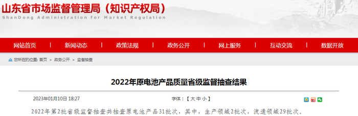山东省2022年原电池产品质量省级监督抽查结果