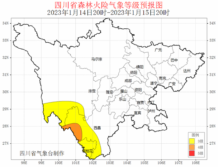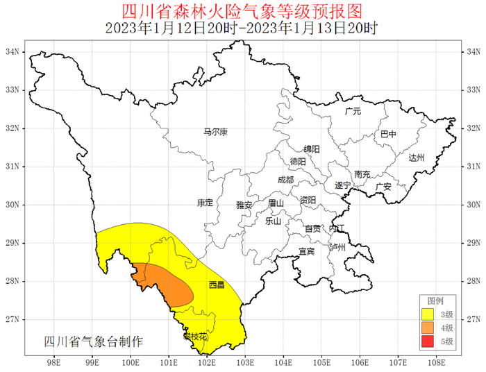 据最新气象资料分析:预计2023年1月12日20时~15日20时,甘孜州南部、攀西地区西部以晴间多云天气为主,空气干燥,森林火险气象等级为3级,局部地方可达4级;请相关州市加强火源管理,做好森林防火工作。