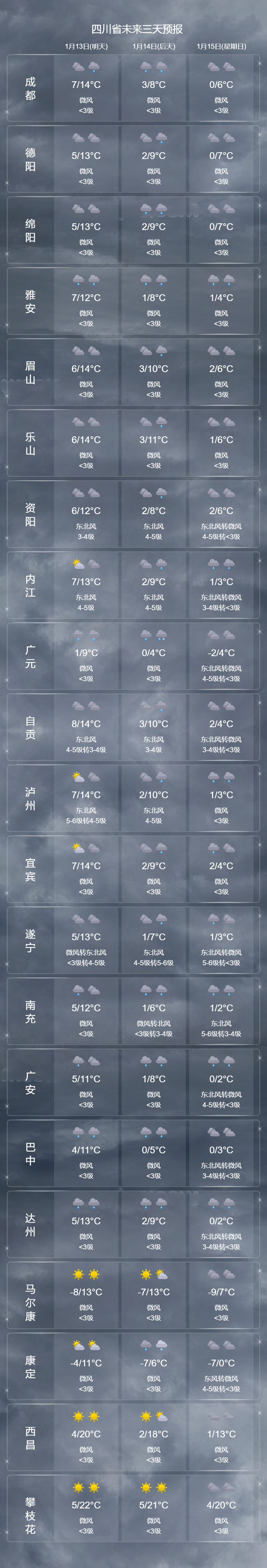 预计14~15日盆地阴天,大部分地方小雨,东北部局部中雨,盆周山区小雪或雨夹雪,高原大部晴,局部阵雪,攀西地区晴,凉山州东北部有阵雪;16~18日盆地阴天间多云为主,局部小雨,川西高原和攀西大部晴,部分地方阵雪(雨),局部中雪。
