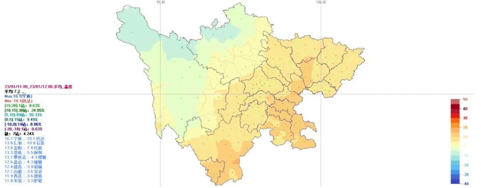 24小时内,盆地最高气温:盆地北部9~13℃,其余地方14~16℃;最低气温:8~10℃。