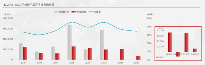据戴德梁行数据显示,2022年,长沙甲级写字楼市场总存量维持在256.5万平方米。受经济下行压力和疫情反复冲击等多重因素叠加影响,长沙甲级写字楼活跃度受挫,租户普遍更趋谨慎,2022年甲级写字楼市场共录得约7.0万平方米的净吸纳量。