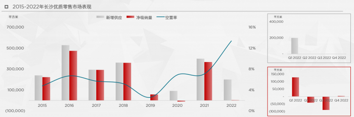 和甲级写字楼市场一样,2022年长沙优质零售市场同样处于低迷。退租现象延续,购物中心空铺增多,全年共录得净吸纳量约0.4万平方米。受此影响,截至四季度末长沙优质零售市场整体空置率为13.4%。