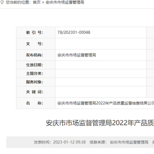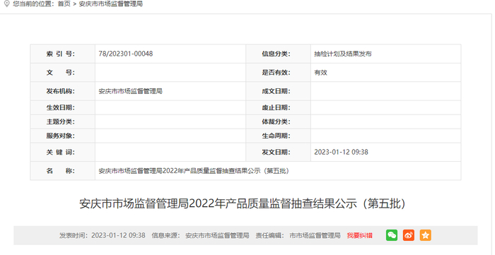 中国质量新闻网讯 2023年1月12日,安徽省安庆市市场监督管理局网站公示2022年产品质量监督抽查结果(第五批)。