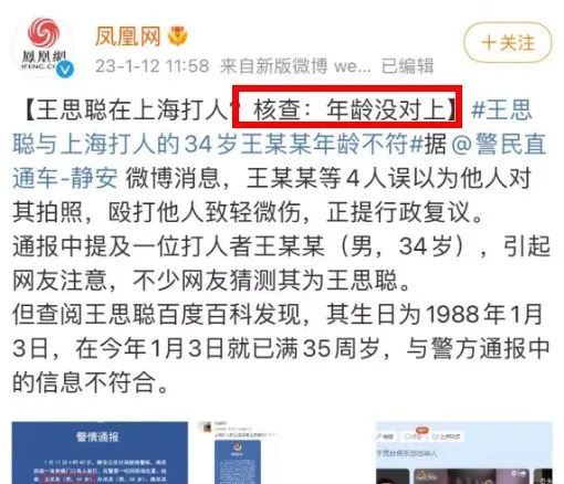 凤凰网是第一家把打人事件与王思聪牵连上的媒体,他们在查阅王思聪百度百科发现王思聪的生日在1月3日,按中国人习惯过阳历生日来看,王思聪已经35岁了,这明显和通报中的王某某(男,34岁)的情况不相吻合。