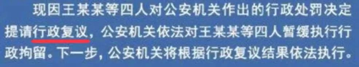 值得注意的是,王思聪等四人已经对公安机关作出的行政处罚决定提请行政复议,公安机关依法对他们暂缓执行行政拘留。下一步,公安机关将根据行政复议结果依法执行。